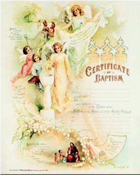 A reproduction of a 1911 stone lithograph baptismal certificate. Originally published by Jellings and Graham of