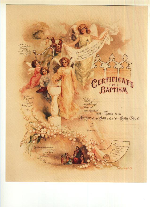 This is a color reproduction of a 1911 stone lithograph baptismal certificate. Originally published by Jellings and Graham of Cincinnati, Ohio. Pure Lily of the Valley encircle the baptismal scenes from the scriptures